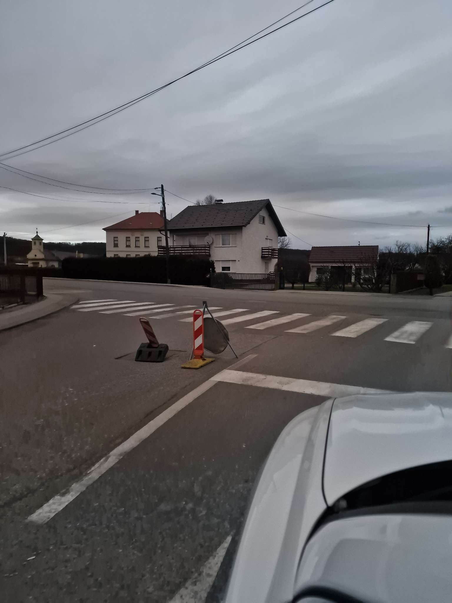 Na sred križananja vec 10 dana je ovako, to je vrlo frejventno krizanje na kojem je i pjesacki prijelaz i blizina škole, ove se oznake ne vide kad se dolaziniz smjera zapresica i kad je drugi auto tu iz suprotnog smjera i moze doci do opasnih prometnih situacija za sve sudionike prometa HITNO rijesiti !!! Ovo se STALNO PONAVLJA